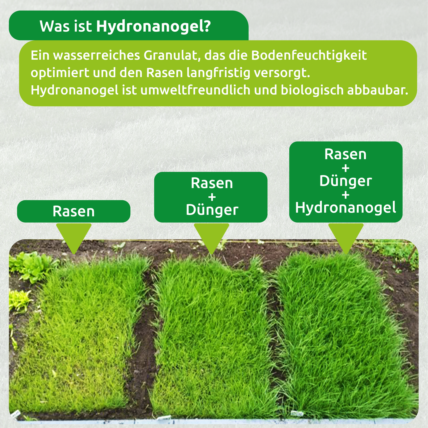 Hochwertiger Dünger und Hydronanogel sind direkt in der Rasenmatte integriert und versorgen den Rasen optimal mit Nährstoffen
